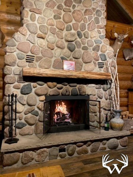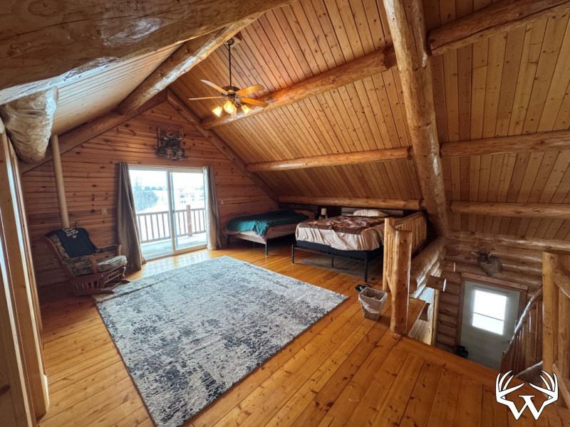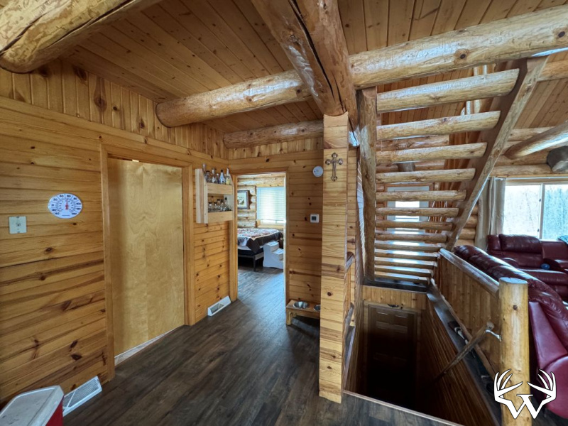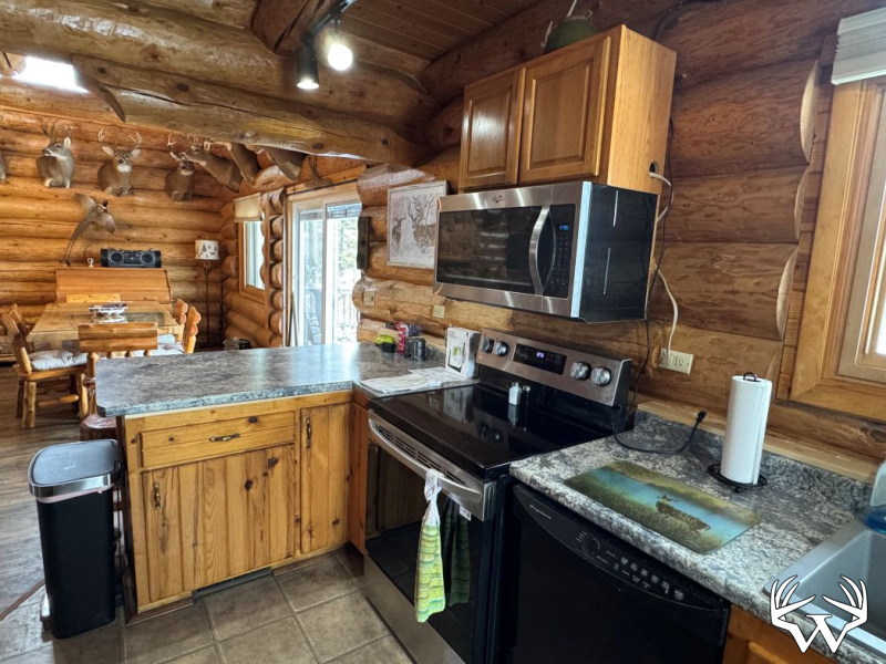 At the heart of the property sits a freshly remodeled 2-bedroom, 2-bath log home, blending rustic charm with modern comfort. The living room features a cathedral ceiling and a striking fieldstone natural fireplace, creating a warm and inviting focal point. A spacious loft adds additional living or sleeping space.